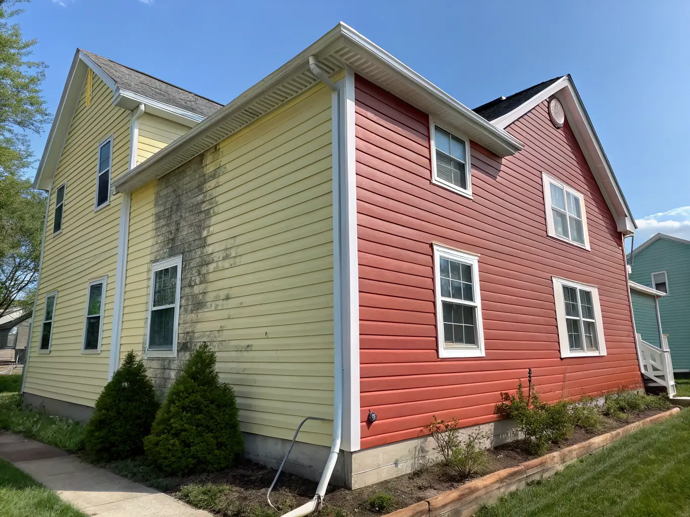 - Side-by-side photos of the building exterior before and after soft washing.