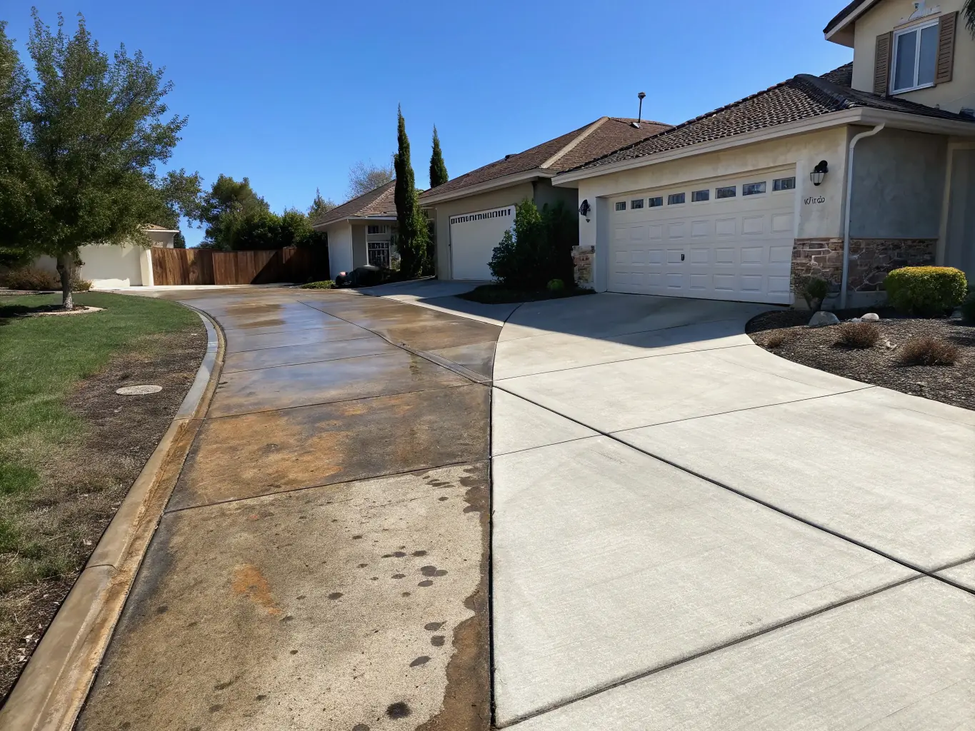 - Before-and-after images of a concrete driveway showing significant cleaning results.